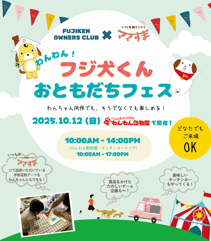 10月12日日曜日、フジケンとのコラボ「フジ犬くんおともだちフェス」がわんわん動物園内で開催されます。